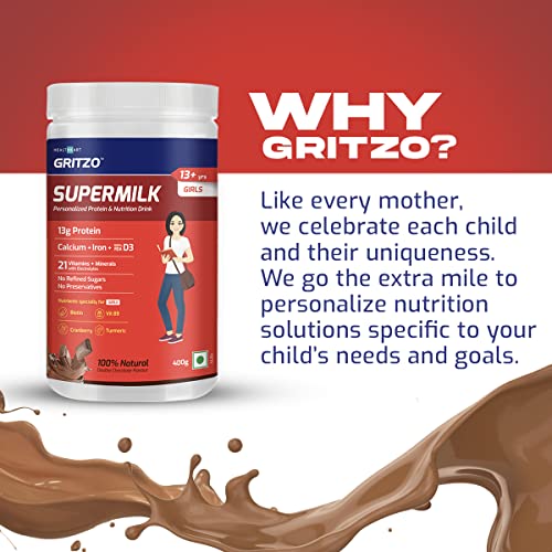 Gritzo Supermilk 13 Girls Kids Nutrition Health Drink Protein Powder For Kids Growth Sports High Protein 13 G Calcium D3 21 Nutrients Natural Double Chocolate Flavour 400 G
